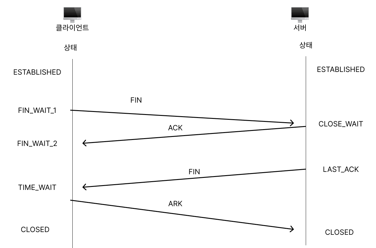 - 클라이언트가 연결을 닫으려고 할 때 FIN으로 설정된 세그먼트를 보냅니다. 그리고 클라이언트는 FIN_WAIT_1 상태로 들어가 서버의 응답을 기다립니다
