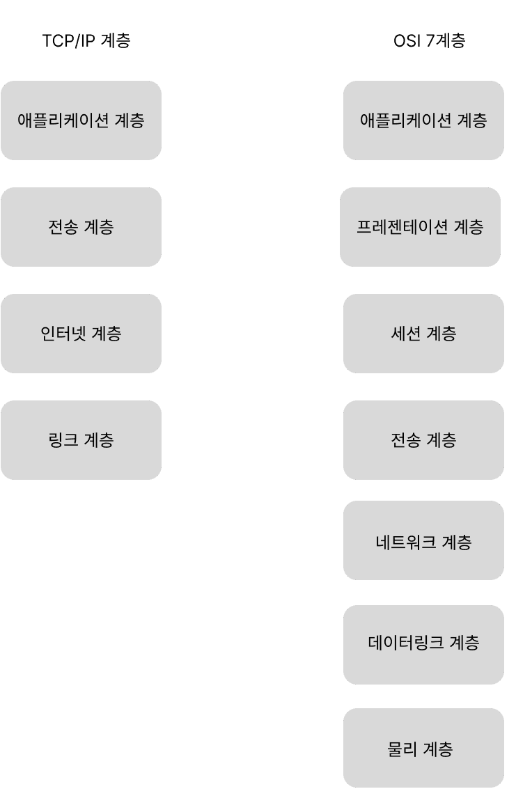 OSI 계층의 경우 애플리케이션 계층을 세개로 쪼개고 링크 계층을 데이터 링크 계층, 물리 계층으로 나눠서 표현하는 것이 다릅니다
