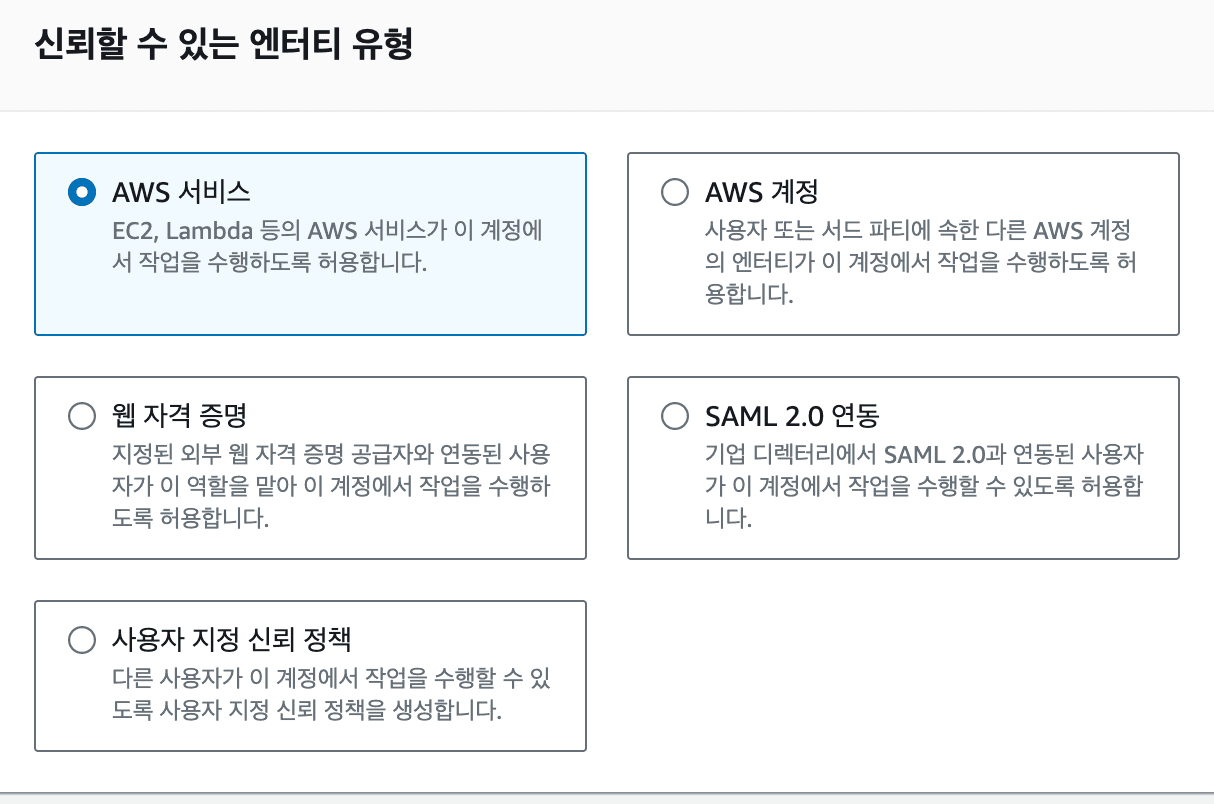 S3접근 권한을 얻기위해 AWS IAM을 통해 역할을 생성해줍니다. IAM Console에서 생성을 눌러준뒤 AWS 서비스를 통해 생성해줍니다.