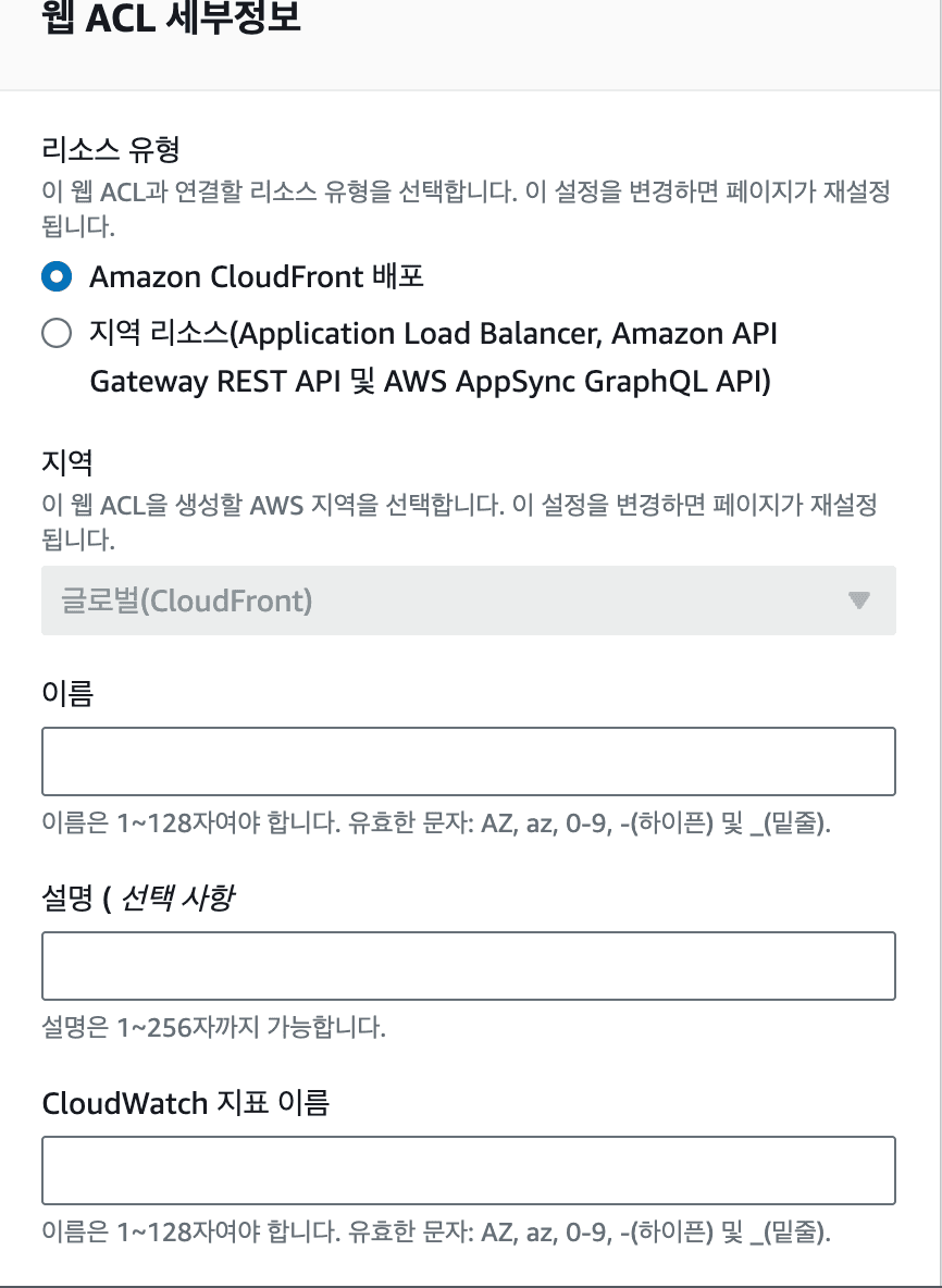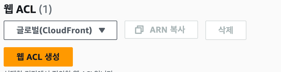 이제 방화벽을 설정해봅시다 cloudfront이기 때문에 global로 두고 새롭게 만들어줍니다