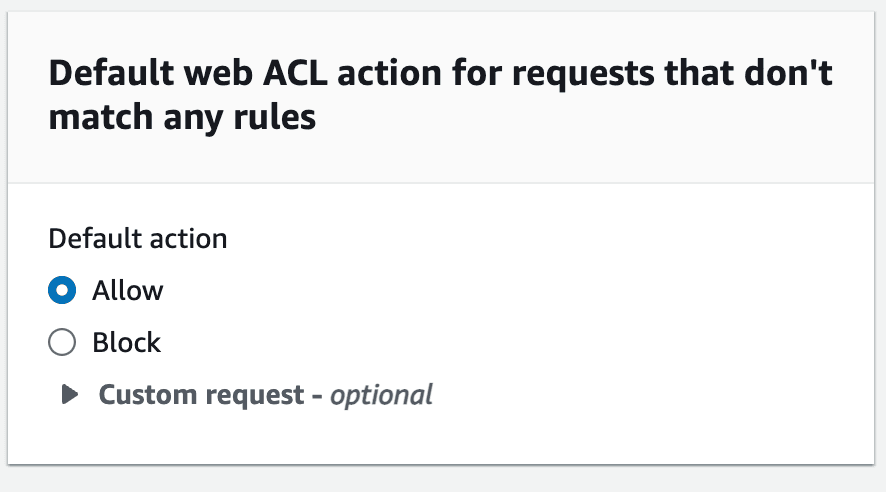 마지막으로 이 부분에 룰에 해당하지 않는 요청은 막아야하기에 Block을 선택해주고 설정을 완료합니다.