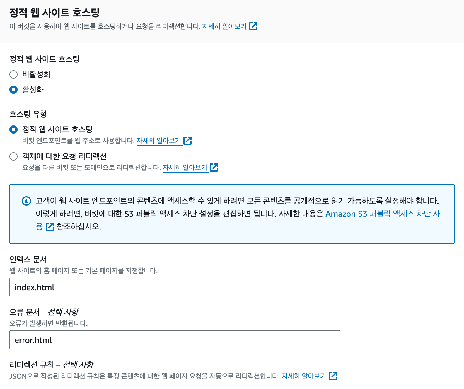생성한 S3설정에 들어가 속성탭에 최하단에 보시면 정적 웹 호스팅을 통해 설정을 해줍니다. storybook 빌드파일을 보면 index.html 기준으로 움직이기 때문에 index 문서에 index.html을 작성해줍니다.
